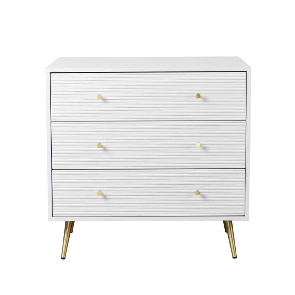 Η συρταριέρα Zizel αποπνέει κομψότητα και μοντέρνο στυλ, αποτελώντας την ιδανική επιλογή για χώρους με εκλεπτυσμένη αισθητική. Κατασκευασμένη από επένδυση μελαμίνης σε λευκή απόχρωση, εντυπωσιάζει με την καθαρότητα και την απλότητά της. Τα τρία ευρύχωρα συρτάρια διαθέτουν ριγέ όψεις από λακαριστό MDF, προσδίδοντας μία διακριτική υφή και μοναδικότητα. Τα χρυσά μεταλλικά πόδια ολοκληρώνουν το σχέδιο, χαρίζοντας μία πινελιά πολυτέλειας και σταθερότητας. Η Zizel συνδυάζει την πρακτικότητα με την αισθητική, αναβαθμίζοντας τη διακόσμηση κάθε σύγχρονου σπιτιού.