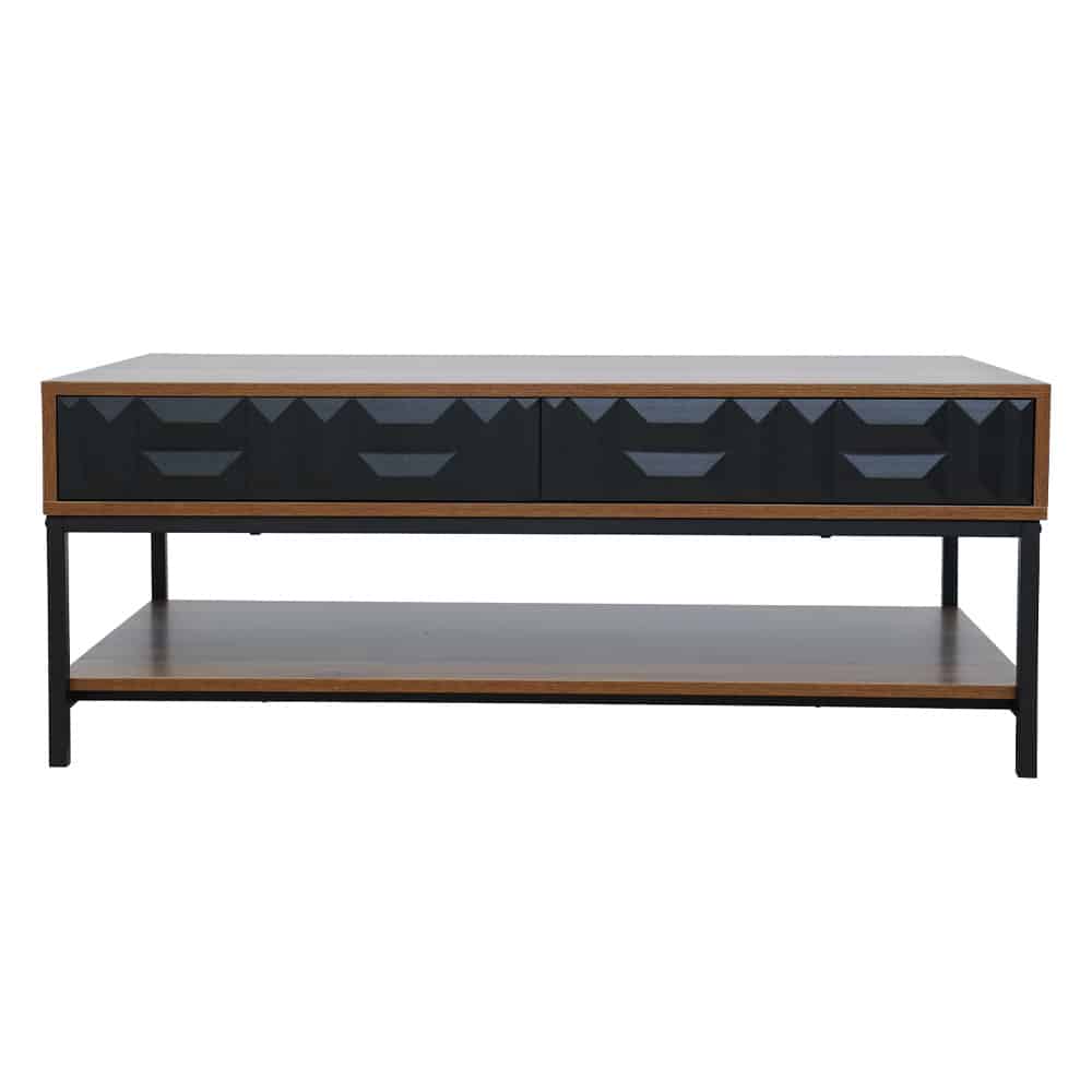 Το τραπεζάκι σαλονιού Zuma ξεχωρίζει για το μοναδικό του design και την πολυλειτουργικότητά του. Η καρυδί μελαμίνη προσφέρει ζεστασιά και διαχρονικό στυλ, ενώ τα δύο μαύρα ανάγλυφα συρτάρια δίνουν μια ξεχωριστή αισθητική πινελιά, προσφέροντας ταυτόχρονα πρακτικό αποθηκευτικό χώρο. Τα δύο μικρά ράφια στο πίσω μέρος και το μεγάλο απο κάτω, παρέχουν επιπλέον χώρο για αντικείμενα, κάνοντάς το ιδανικό για την οργάνωση του σαλονιού σας. Με τα μαύρα μεταλλικά πόδια του, το Zuma συνδυάζει την κομψότητα με τη στιβαρότητα, προσφέροντας ένα εντυπωσιακό και ανθεκτικό κομμάτι για κάθε μοντέρνο εσωτερικό χώρο.